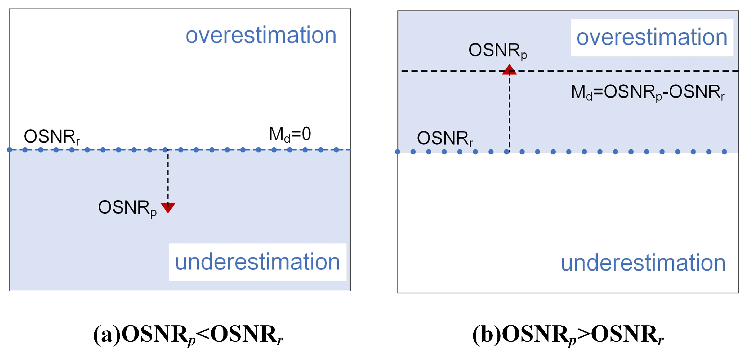 In (4), F denotes the mapping relation between the modulation format and the capacity of lightpaths. The relationship between prediction value O S N R p and the actual value O S N R r has two situations, i.e., O S N R p = O S N R r and O S N R p O S N R r . When O S N R p = O S N R r , it is the desired situation that the optimal transmission data capacity can be obtained, while for O S N R p O S N R r , the used modulation format and network capacity will be affected accordingly. Here we study the influence of overestimation (i.e., O S N R p > O S N R r ) and underestimation (i.e., O S N R p < O S N R r ) in Figure 1.