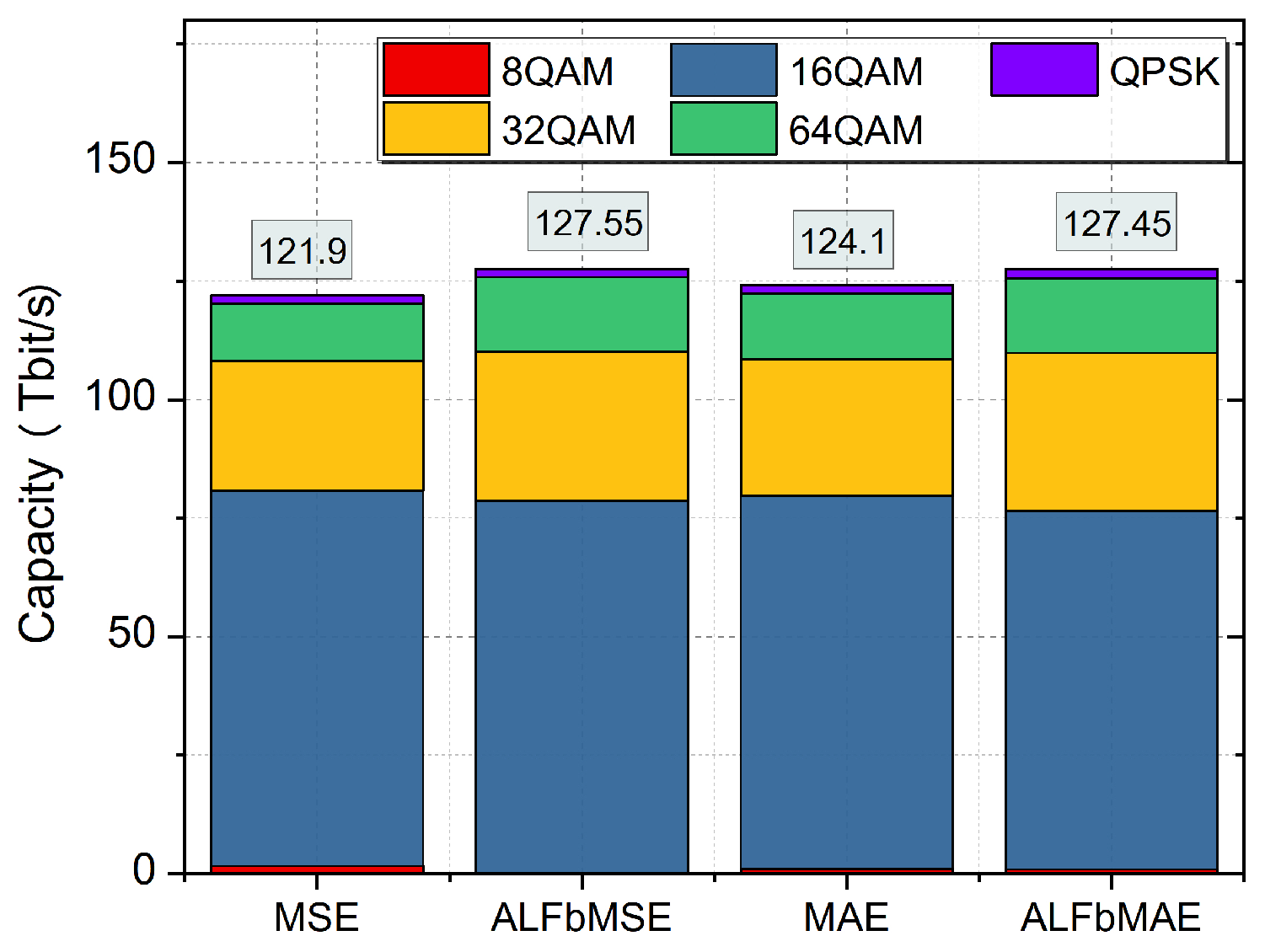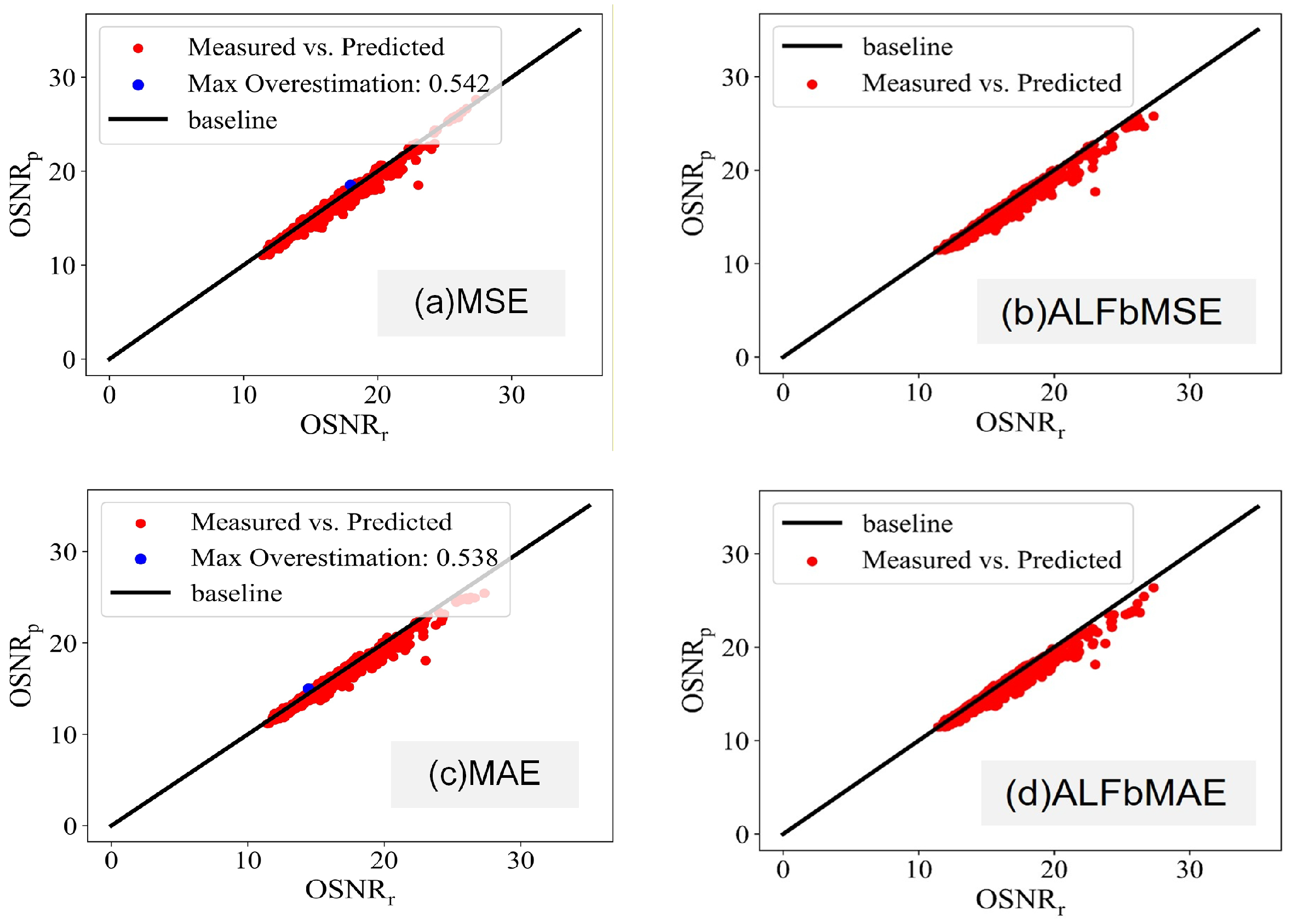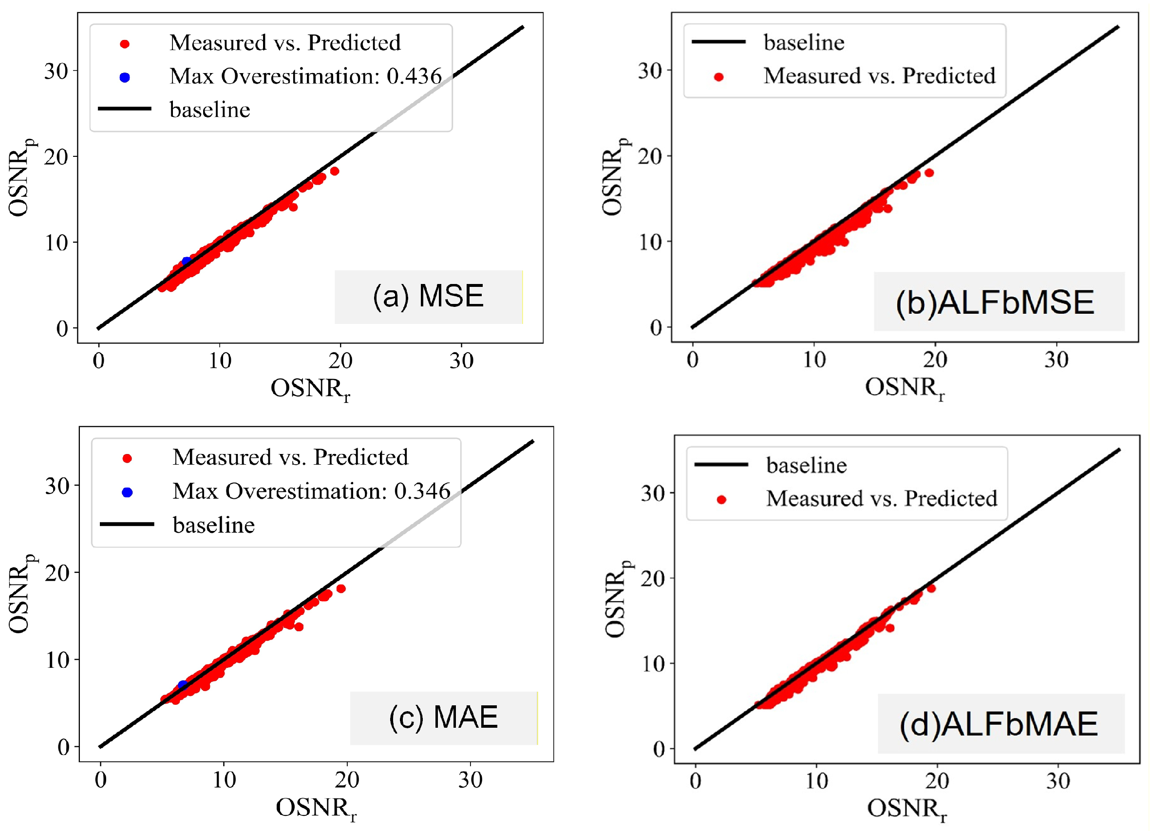 The performance of machine learning (ML)-based prediction models is primarily governed by three key factors: the training dataset, the model’s network architecture, and the loss function [7]. Among these, the loss function plays a crucial role by directing the network’s training process and substantially influencing prediction outcomes. These predictions can manifest as either overestimations or underestimations. Overestimation occurs when predicted values exceed actual measurements, potentially leading to the selection of higher-order modulation formats. This may result in improperly configured lightpaths that compromise network reliability. To solve this problem, the design margin is typically defined as the maximum overestimated prediction to ensure network reliability. Conversely, underestimation means that the predicted value is less than the actual value, therefore leading to the selection of a lower modulation format for the lightpath, which leads to a lower capacity for the current lightpath. The influences on network capacity are different, such as the overestimation affecting the capacity of all the lightpaths in the whole network when the design margin increases, while the underestimation only makes the current lightpath capacity reduce.