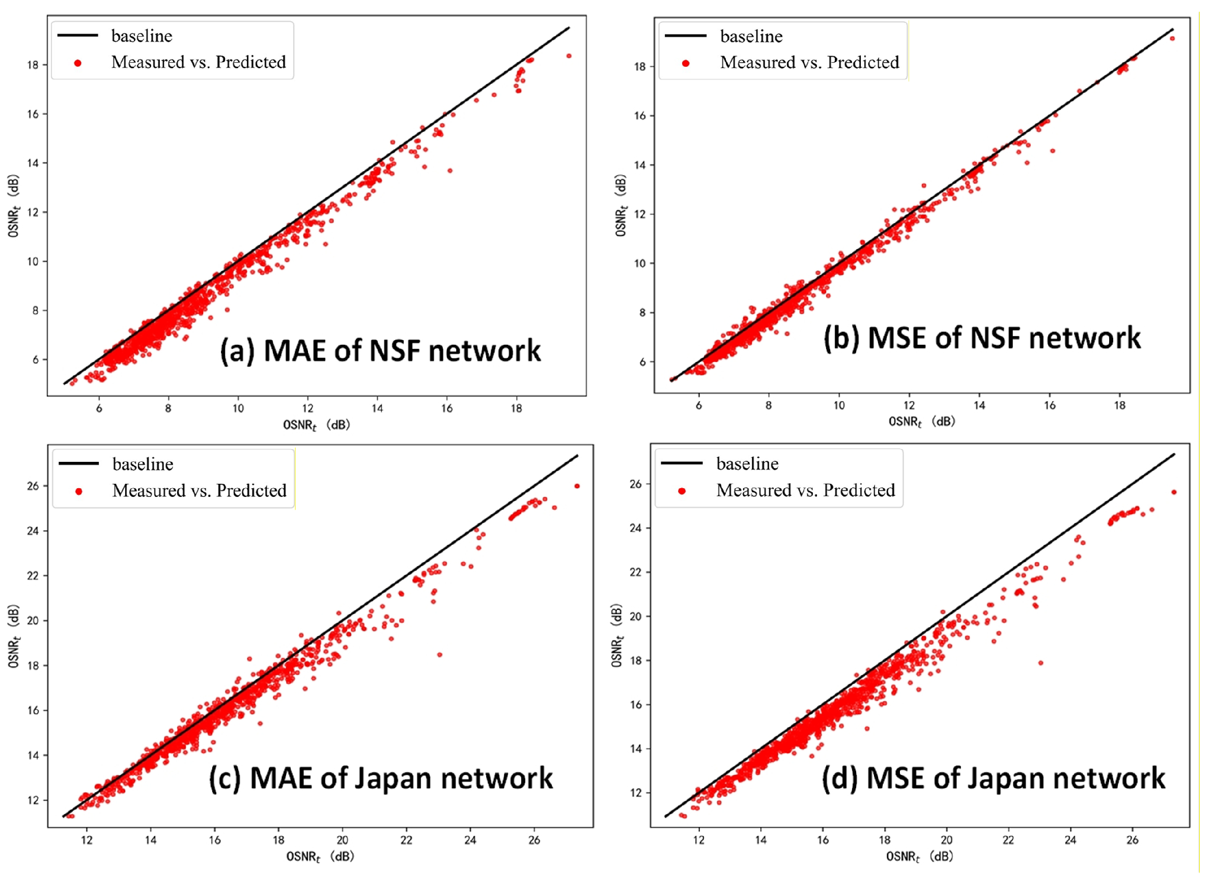 (4) Network performance is evaluated in terms of capacity using two standard network topologies, i.e., Japan and NSF networks, and the effectiveness of our proposed ANN-based QoT estimation models with asymmetric loss functions is validated through comprehensive simulations.