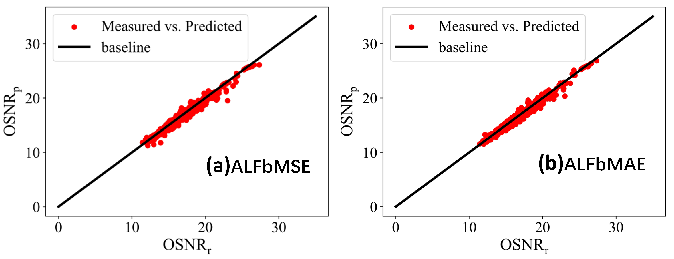 Regression models offer significant advantages over classification approaches by providing quantitative estimates of QoT parameters and associated margins. Among ML-based regression techniques, artificial neural networks (ANNs) have emerged as particularly effective for QoT prediction. An OSNR regression model based on ANN was proposed and verified on a practical platform [17]; the experimental results show that the proposed model achieves high accuracy in the actual transmission system, and the RMSE of the model is less than 1 dB. Azzimonti et al. [18] examined multiple ML-based Q factor prediction models across three transmission networks, finding that ANN-based approaches delivered the best generalization performance with 99% accuracy. Similarly, Wan et al. [19] introduced a dual-stage algorithm architecture that achieved OSNR estimation accuracy exceeding 99% for low-margin elastic optical networks.