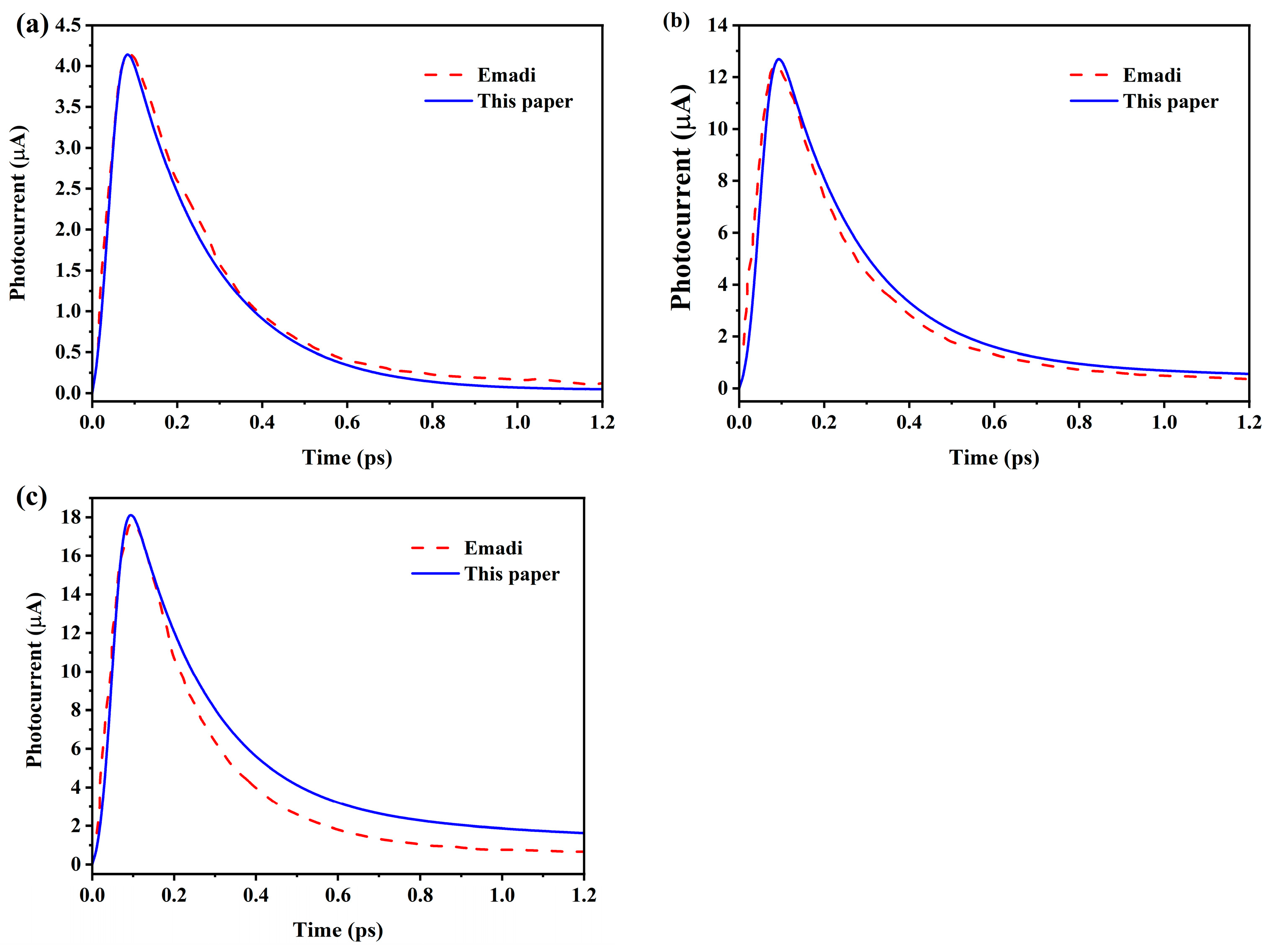 Under the model constructed in this paper, the incident parameters are the same as the model designed by Emadi et al. The transient photocurrents are shown in Figure 2. The peak currents of LE PCA, TE PCA, and IE PCA are 4.2 μA, 12.7 μA, and 18 μA, respectively, which are basically in good agreement with each other in terms of the magnitude of the peak current, and the degree of deviation is less than 5%. The simulation results of transient photocurrent under the model of this paper are very similar to those obtained under the energy balance transport model, thus verifying the validity of the model of this paper. In addition, we compared the THz-PCA emission intensity with the experimental results reported by Fumiaki Miyamaru et al. [33] and with the simulation results of Emadi et al. [25]. The substrate material, electrode geometry, and laser parameters were matched to those in the cited studies. As shown in Figure 3, the emission intensities are in good agreement, further validating the effectiveness of our model.