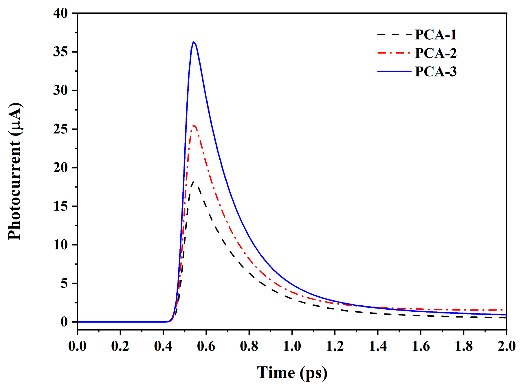 Figure 5. Transient photocurrent for photoconductive antennas PCA-1, PCA-2, and PCA-3.