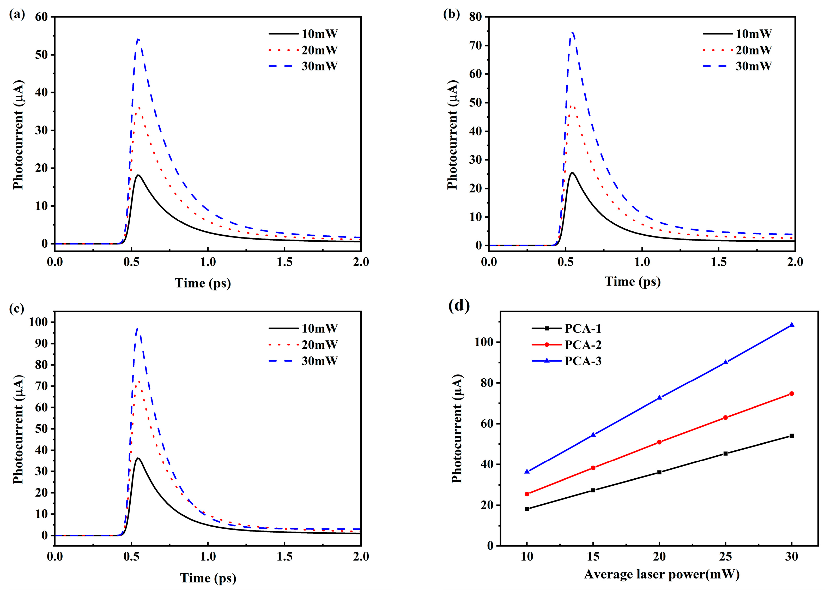 Figure 6. Transient photocurrent of photoconductive antenna under different light intensities at a bias voltage of Vbias = 20 V: (a) PCA-1, (b) PCA-2, (c) PCA-3, (d) photocurrent amplitude as a function of average optical power intensity.