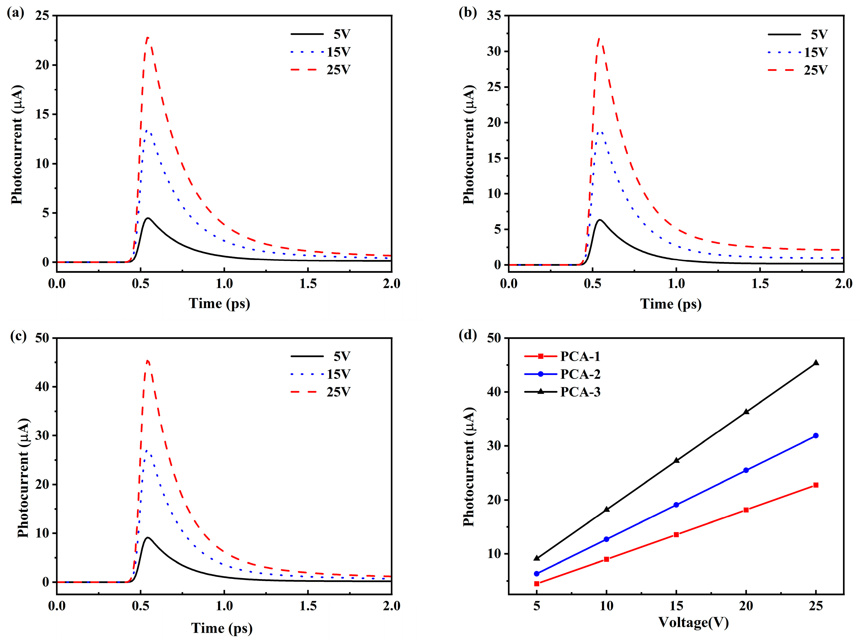 Figure 7. Schematic diagram of transient photocurrent of photoconductive antenna at different voltages (average laser power Pave = 10 mW): (a) PCA-1, (b) PCA-2, (c) PCA-3 (d) photocurrent amplitude as a function of bias voltage.