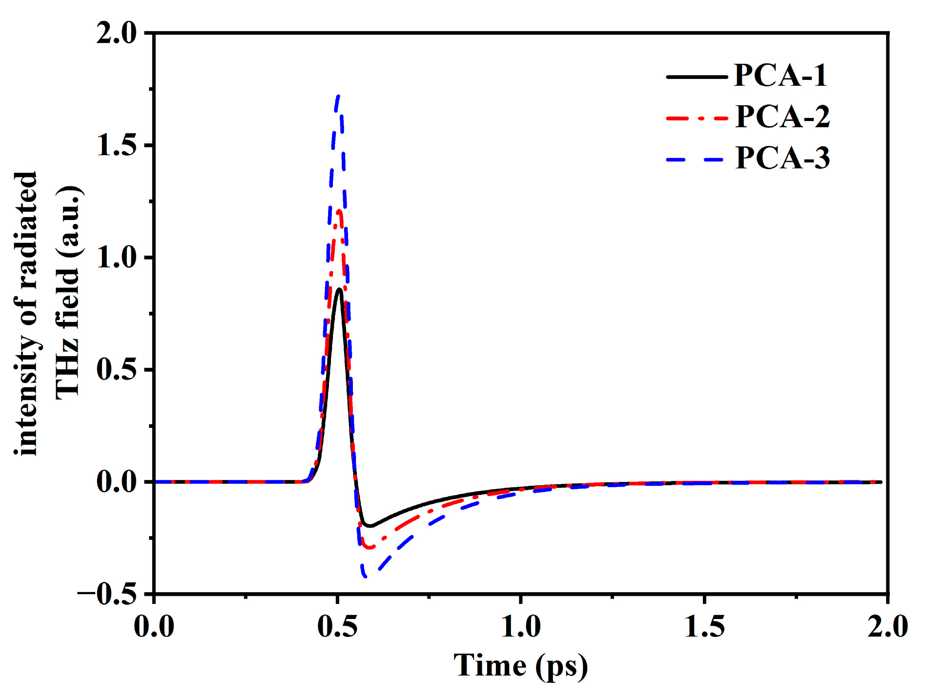 Under the same simulation parameters, the photocurrent magnitude of PCA-1 (18.1 μA) is basically equal to that of IE PCA (18 μA), the photocurrent magnitude of PCA-2 (25.4 μA) is enhanced by about 45% compared to that of IE PCA, and the photocurrent magnitude of PCA-3 (36.3 μA) is enhanced by about 100% compared to that of IE PCA. The analysis shows that the main reason for this is that, on the one hand, the PCA-1 and PCA-2 electrode structures increase the effective utilization area of the incident light compared to the conventional electrode structure, which can increase the area of the laser light incident to the substrate and thus improve the absorption rate of the light. The effective utilization area of the PCA-2 is more than that of the PCA-1, which makes the photocurrent magnitude of the PCA-2 45% larger than that of the PCA-1, and the PCA-3 has a higher photocurrent magnitude (36.3 μA) compared to the IE PCA. Meanwhile, the design of the electrode structure of PCA-3 reduces the distance between the anode and the cathode, which helps to reduce the distance of the photocarriers transported in the substrate and thus reduces the compound loss of the carriers, which improves the magnitude of the photocurrent and also improves the efficiency of the generation of terahertz waves. Prof. M. Jarrahi’s group has pioneered plasmonic photoconductive emitters by employing plasmonic contact electrodes to localize the optical field at the contacts and reduce the carrier transit length, thereby yielding substantial performance gains [43,44,45]. These designs rely on nanometer-scale patterning, whereas our approach uses conventional photolithography with micrometer-scale features, favoring process accessibility while remaining compatible with LT-GaAs thin-film heterogeneous integration flow.