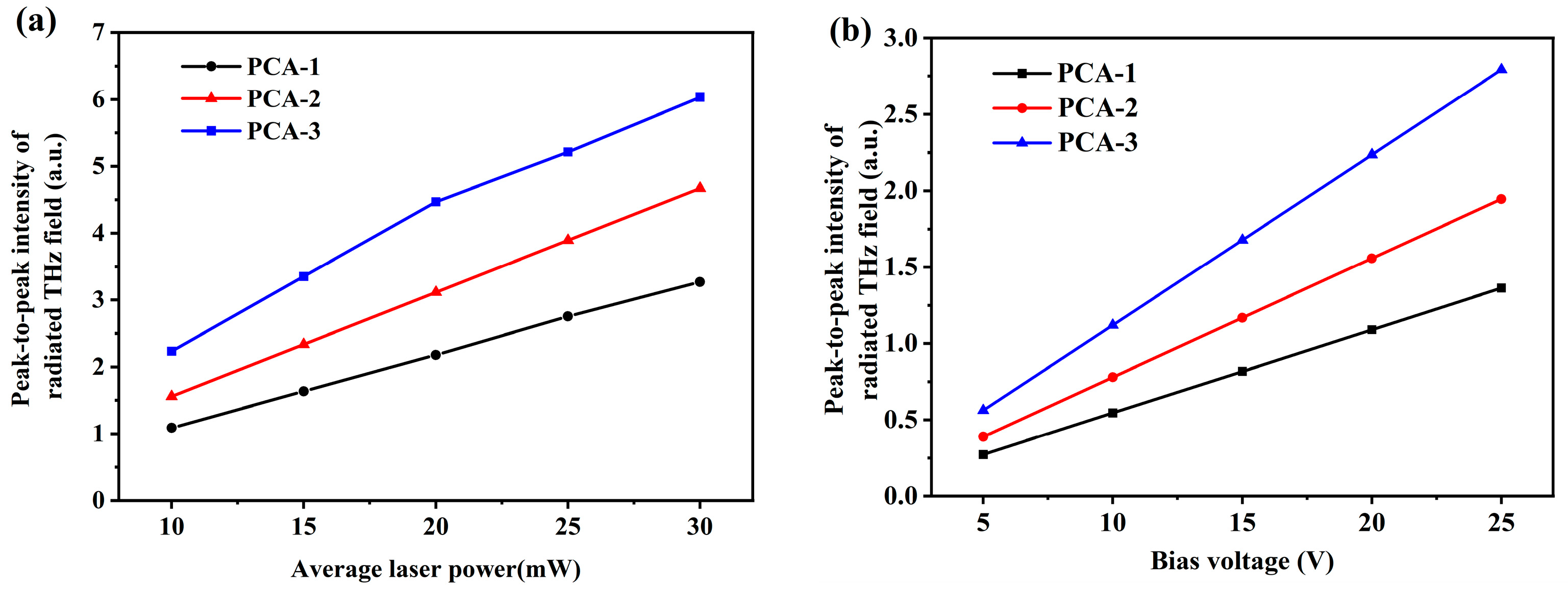 Figure 9. Inter-peak intensity of the radiated THz field as a function of (a) average laser power (bias voltage Vbias = 20 V) and (b) bias voltage (average laser power Pave = 10 mW).