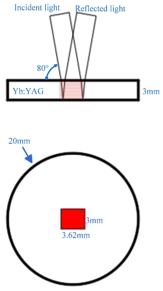 To mitigate the thermal load in Yb:YAG crystal under high-power pumping, an end-bonding technique was employed. An undoped YAG crystal of identical radius and a thickness of l = 3 mm was bonded to the pumped end-face of the Yb:YAG crystal, as illustrated in Figure 11.