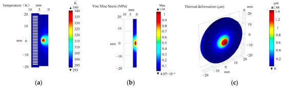 Internal temperature (a), thermal stress (b) and thermal deformation (c) distribution of a 3 mm undoped YAG thickness bonded Yb:YAG crystals under 100 W pump power and room temperature (293 K) cooling conditions.