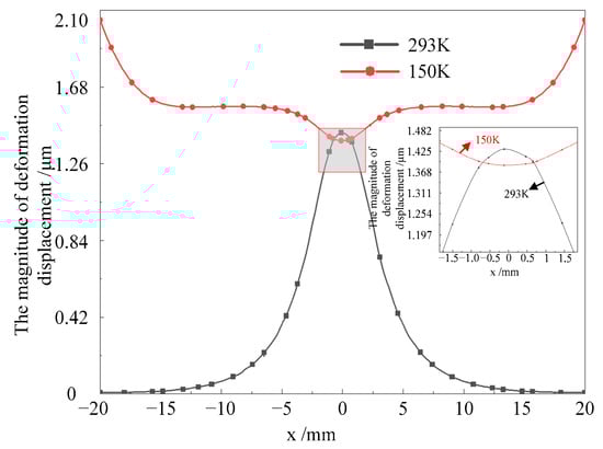 Figure 6 shows the magnitude of end-face deformation along the x-direction on surface S1. It can be observed that at room temperature, the maximum deformation occurs at the center of the surface. Under cryogenic conditions, however, the internal compressive stress causes the maximum deformation to appear at the edges of the surface, with its absolute value being greater than the deformation measured at the same location under room temperature conditions. Fortunately, the variation in end-face deformation under low temperatures is more gradual. In the pumping region, the difference between the maximum and minimum deformation is 0.3 μm at room temperature, whereas under low temperatures, this difference is reduced to 0.05 μm.