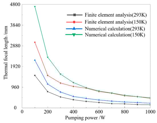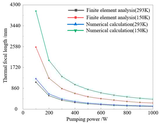 where k is the thermal conductivity of the gain crystal, A is the effective area of the pump light, Pin is the incident pump power, η is the thermal conversion efficiency, dn/dT is the thermal optical coefficient, α is the absorption coefficient of the crystal, and h is the thickness of the crystal. Figure 10 shows the variation in the thermal lens focal length obtained by two different methods with increasing pump power. It can be observed that the thermal lens focal lengths derived from both the finite element method and the numerical calculation method exhibit consistent trends. However, under the same pumping and cooling conditions, the thermal focal length obtained through numerical calculation is larger than that from finite element analysis. This discrepancy primarily arises because the numerical calculation mainly considers the thermal lensing effect caused by refractive index changes due to internal temperature gradients in the crystal, whereas the finite element method comprehensively accounts for the combined effects of both temperature gradients and end-face deformation.