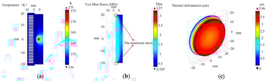 The distribution of temperature (a), thermal stress (b) and thermal deformation (c) of Yb:YAG with the pump power of 100 W and cooling temperature of 150 K.