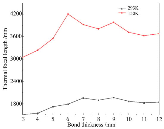 The thickness of the undoped YAG (l) in the bonded crystal also affects the thermal focal length. Figure 16 shows the thermal focal length under a 100 W pump power, obtained using the ray-tracing method, for different undoped YAG thicknesses. It can be observed that as the thickness of undoped YAG increases, the thermal focal length significantly increases under both room-temperature and low-temperature cooling conditions. However, when the thickness exceeds 6 mm, further increase in YAG thickness shows limited improvement in mitigating the thermal lens effect of the crystal.