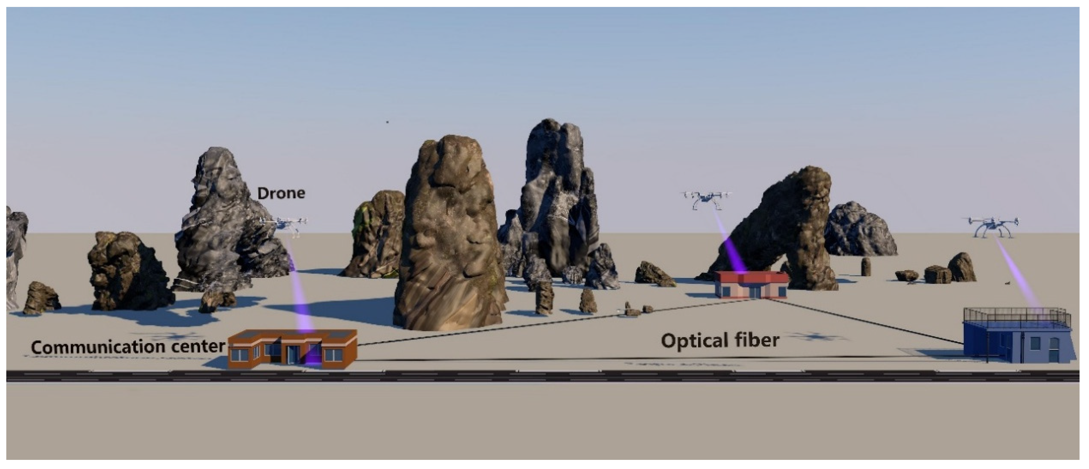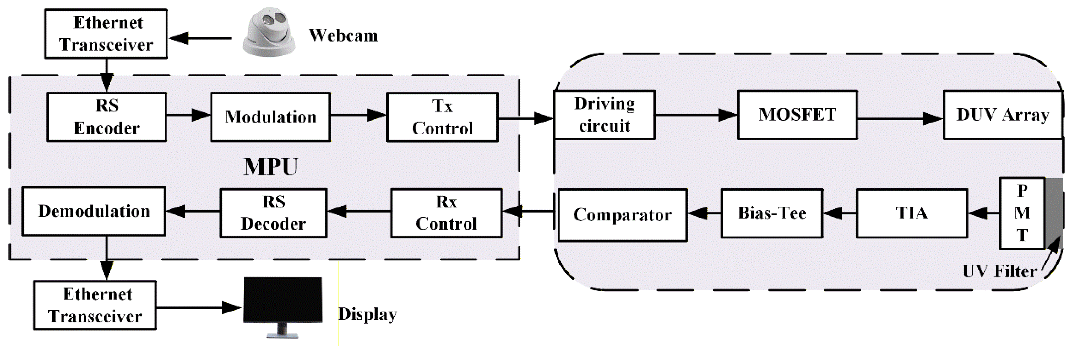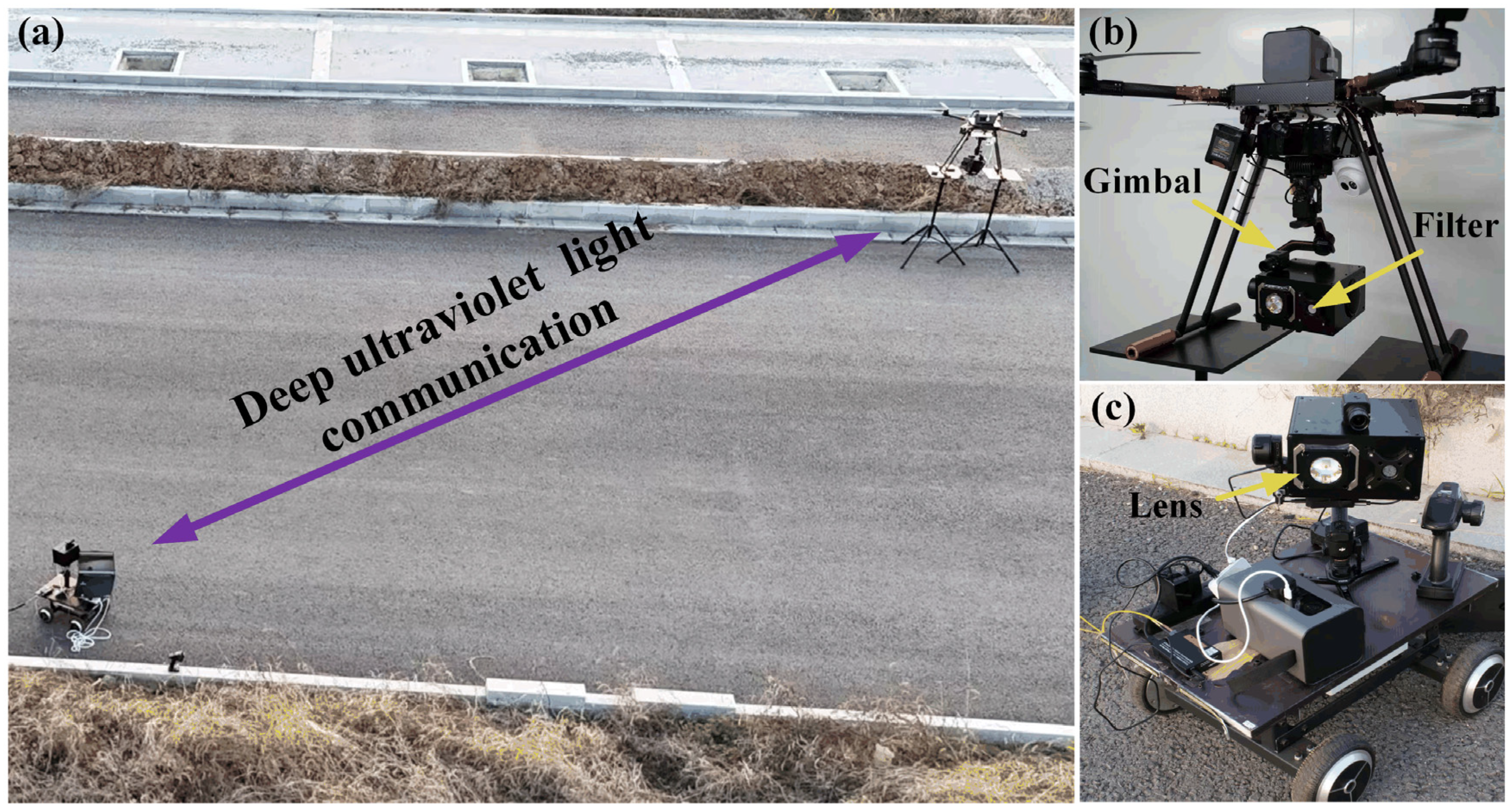- Mo, X.; Liang, Y.; Wang, L.; Qi, Z.; Zhou, J.; Zhang, L.; Liu, P.; Gou, J.; Wang, Y. Solar-Blind Deep Ultraviolet Light Communication Network. Opt. Express 2025, 33, 36280–36292. [Google Scholar] [CrossRef]