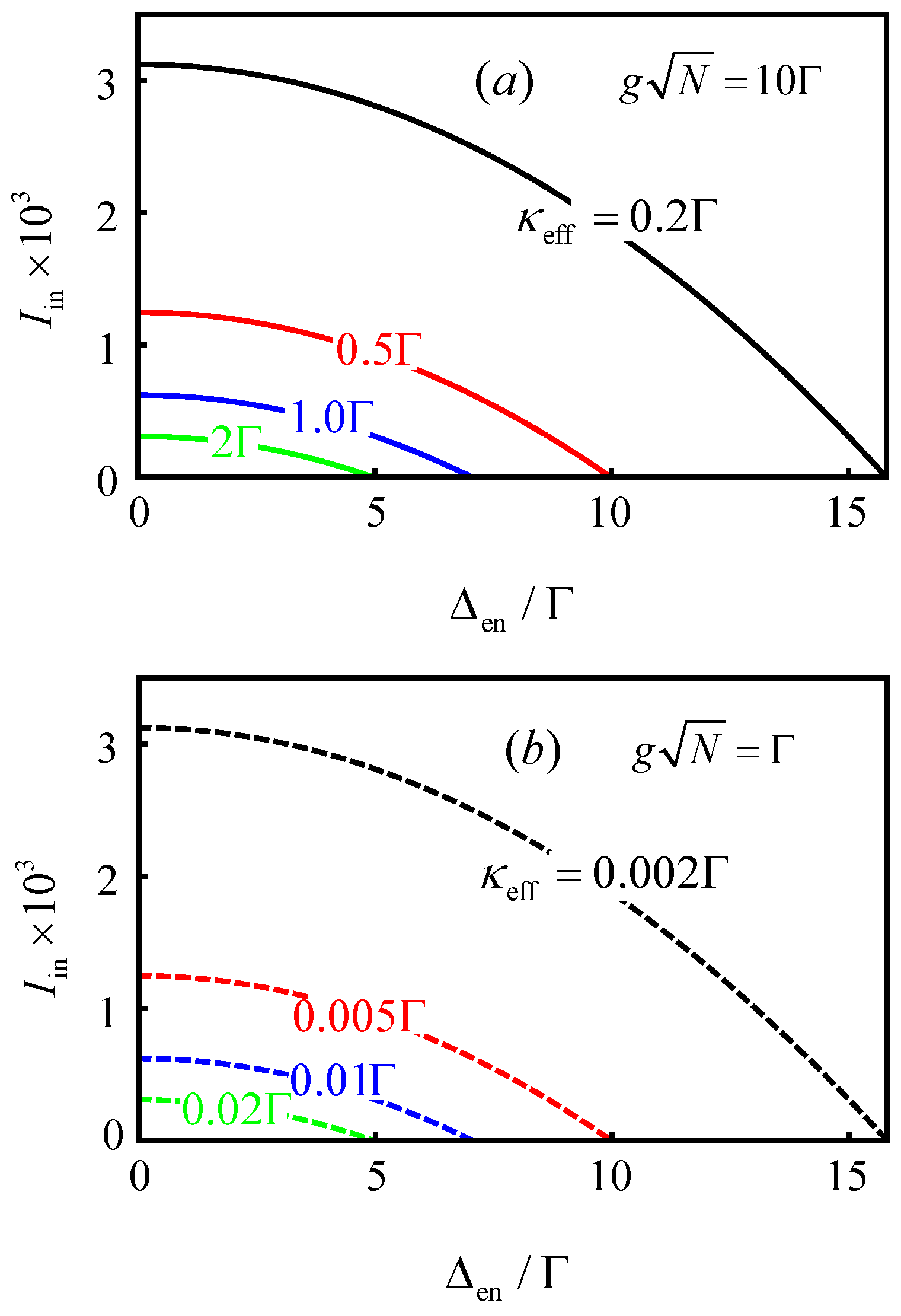 From Equation (16), one can further derive a constraint on the ensemble detuning Δ en required for CPA. The condition of a non-negative intracavity photon number, n α 0 , leads to