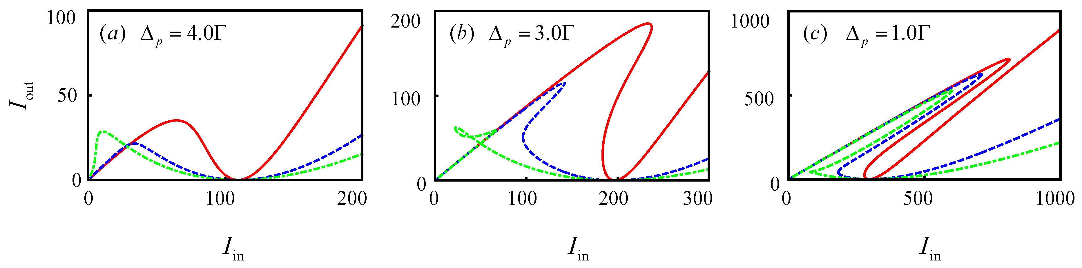 When the detuning is further reduced to Δ en = 4.0 Γ , 3.0 Γ , and 1.0 Γ (Figure 4b–d), the system enters the nonlinear regime. In this regime, the output intensity exhibits bistability, with more intricate bistable patterns appearing in the weak-input-intensity region, i.e., for I in below the value corresponding to I out = 0 . In contrast to the strong-coupling case, the output intensity in the strong-input-intensity region (where I in exceeds the CPA point) is initially suppressed and subsequently enhanced as G increases. Notably, in the weak-coupling regime, CPA does not occur within the bistable region.