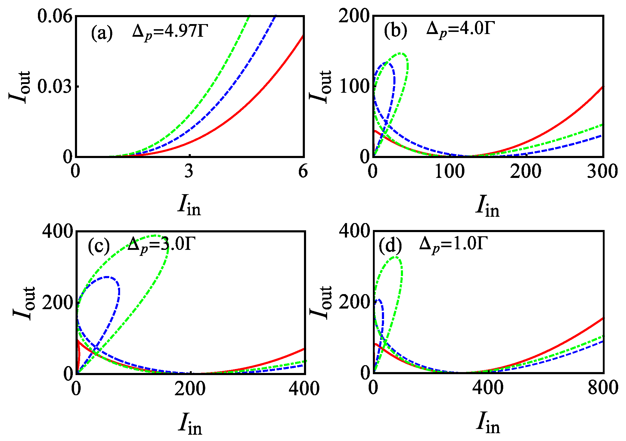 Figure 4. (Color online) The output intensity I out as a function of the input intensity I in under CPA condition for different frequency detunings of the ensemble from the left input field: (a) Δ p = 4.97 Γ , (b) Δ p = 4.0 Γ , (c) Δ p = 3.0 Γ , (d) Δ p = 1.0 Γ . Three chromatic curves in red, blue and green respectively correspond to { G , cos θ } = { 2 Γ , 0.745 } , { 3 Γ , 0.497 } , { 4 Γ , 0.3725 } . Other parameters are the same as in Figure 2 and κ = 3 Γ is assumed. These parameters lead to the effective decay rate κ eff = 0.02 Γ .
