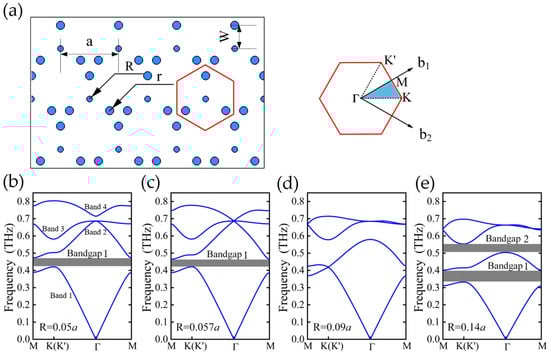 (a) The structure of the rod-type PTI with four cylinders in a C3-symmetric lattice; (b–e) the photonic band structure of the PTI with different values of the radius R = 0.05a, R = 0.057a, R = 0.09a, and R = 0.14a, respectively.