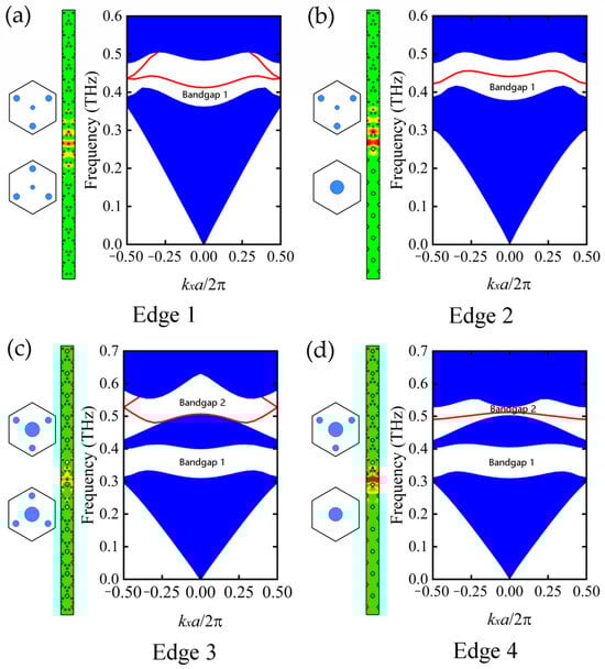 The topological edge states are expected to exist at various edges between two PTIs with different 2-D polarization. Edge 1 is composed of the PTI with R = 0.05a and its inverted counterpart, as shown in Figure 2a. The two PTI domains have the nontrivial Bandgap 1 with the same frequency region but opposite polarization of (1/3, 1/3) and (−1/3, −1/3), respectively, leading to the appearance of two edge states colored in red within Bandgap 1. We also find that a conventional hexagonal-lattice rod-type PhC with the rod radius of 0.15a in the unit cell can have an overlap bandgap region with that of the PTI. If we place this conventional PhC with P = (0, 0) adjacent to the PTI with R = 0.05a to form Edge 2 in Figure 2b, the number of edge states will reduce to one. When a topological nontrivial bandgap is switched to Bandgap 2, such as the PTI case with R = 0.14a, Edge 3 or 4 supporting double or single edge states can also be constructed. However, as shown in Figure 2c,d, in Edge 3 and 4, edge states exist only inside Bandgap 2, while there is no edge state in Bandgap 1. This agrees with the previous analysis of the topological invariants and nontrivial band switch.