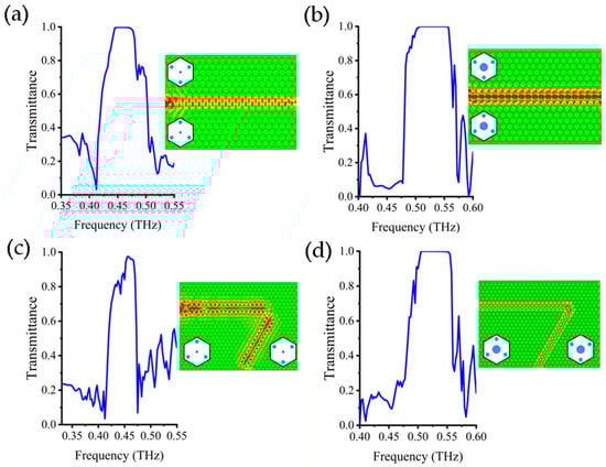 In order to explore the stability of these edge states, we conducted full-wave simulations of the edge wave propagation in straight channels as well as non-straight channels with a 120° turn, formed by Edge 1 and 3, respectively. Here, full-field waves are excited by a THz point source located at the input port of the edge channels. As shown in Figure 3a, the straight channel with Edge 1 supports edge waveguiding with a high transmittance within the working band of 0.43–0.47 THz, and the propagation field distribution at 0.46 THz presents clear field confinement to the domain walls. For comparison, in Figure 3c, the non-straight channel has a narrower high-transmission band, and the propagation field distribution exhibits less smoothness and robustness. For two similar channels formed by Edge 3, the high-transmittance bands of the straight and non-straight channels switch to 0.51–0.56 THz, as illustrated in Figure 3b,d. The field distribution of both the straight and non-straight guiding at 0.52 THz demonstrates better performance with suppressed back scattering, even at the turning. The above phenomenon may be attributed to the fact that the edge states in Bandgap 2 of Edge 3 (after topological band switching) occupy a wider single-mode frequency range than those in Bandgap 1 of Edge 1 (before switching). Nevertheless, such band-switchable topological edge-guiding feature provides better flexibility for THz waveguiding applications. It is worth noting that Bandgap 2 is located at a relatively high frequency. Using a high-frequency bandgap for device design allows larger lattice constants due to the frequency normalization characteristics of photonic crystals, which may reduce the difficulty and cost of THz microstructure fabrication.