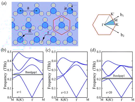 The proposed rod-type THz PTI with a hexagonal C3-symmetric PhC lattice, composed of one central cylinder and three outer cylinders in an air background, is illustrated in Figure 1a. The material of the cylinders is high-resistivity silicon with the dielectric constant of ε1 = 11.7 in the THz range. The lattice constant is a = 300 μm. The radius of the central cylinder is R, which is the main variable of interest. The outer three cylinders have a fixed radius of r = 21 μm, along with a fixed distance of W = 120 μm from the center of the lattice.