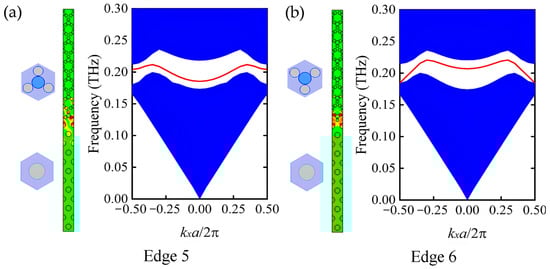 Projected band diagrams and topologically edge states in two types of edges with nontrivial hole-type PTIs. (a) Edge 5 consists of the PTI with ε = 20 and a conventional hole-type PhC; (b) Edge 6 consists of the PTI with ε = 20 rotated by 60° and a conventional hole-type PhC.