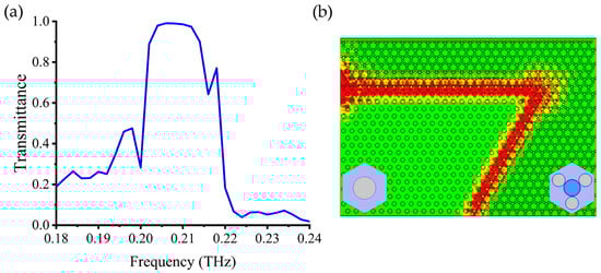 By placing the nontrivial PTI with ε = 20 adjacent to a conventional hole-type PhC with an overlapping bandgap, we verified the existence of topological edge states. Regardless of whether the PTI is rotated by 60° or not, an edge state always emerges inside Bandgap 1 for Edge 5 and 6, as shown in Figure 6a,b. It is worth noting that the edge states in these two edges exhibit different dispersion and single-mode range. Since the edge state spans the entire frequency range of Bandgap 1, which does not satisfy the aforementioned condition for the existence of corner states, the corner states are not considered here. Finally, we examined the topological waveguiding performance of the edge state of Edge 6. A non-straight edge channel with a 120° turn was constructed, as shown in Figure 7. The non-straight waveguide exhibits nearly lossless transmission within the frequency range of 0.204~0.214 THz, with a maximum transmittance reaching 99.8%. The propagation field distribution at 0.206 THz displays smoothness with minimal backscattering, demonstrating excellent immunity to reflection at the turn. These results prove that we can easily control the topological phase of hole-type PTI with a C3-symmetric lattice by central fillers, offering greater tunability in realizing THz configurable waveguide-type devices.