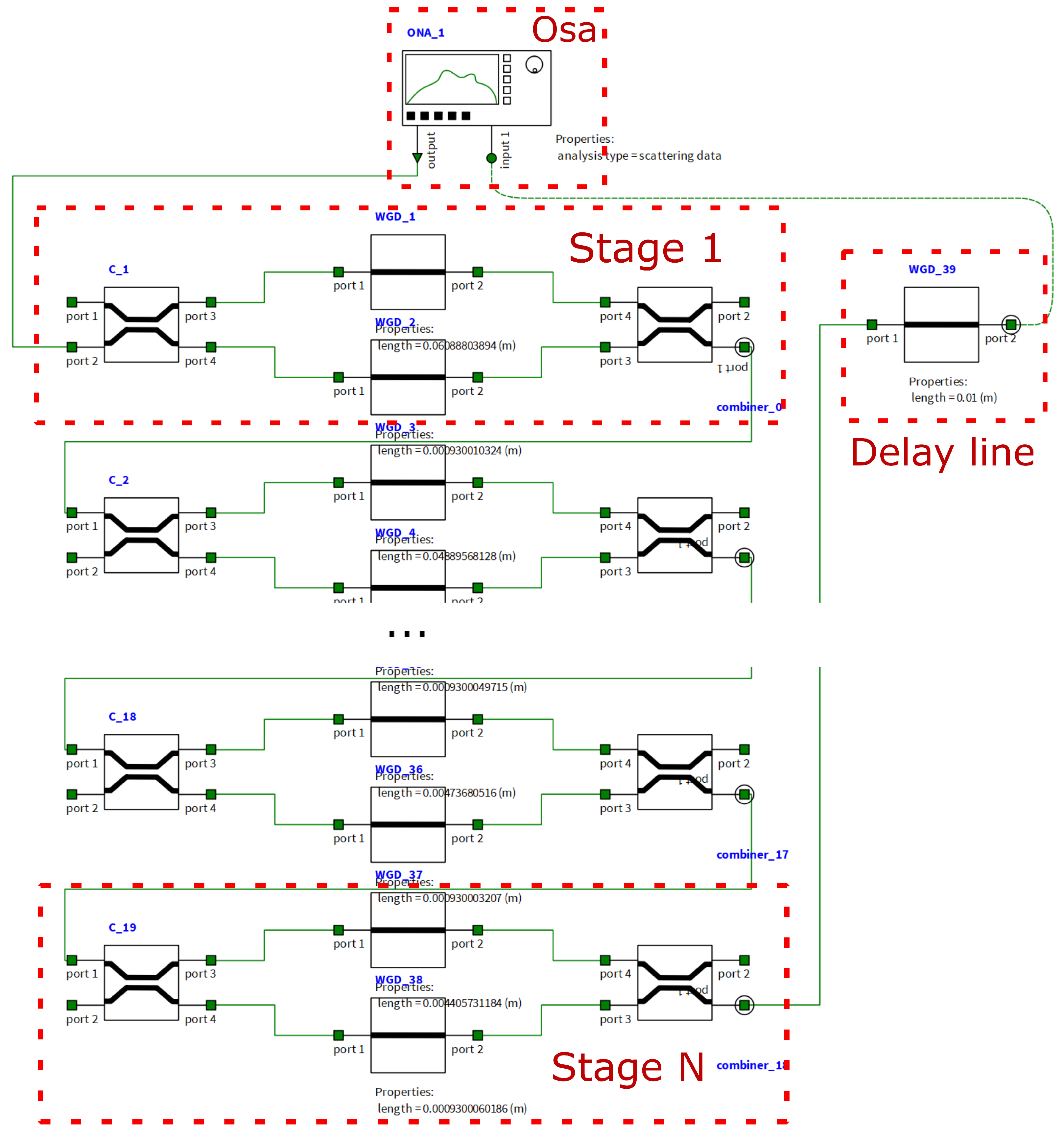 - Arm 1: physical length , amplitude loss coefficient , propagation constant .