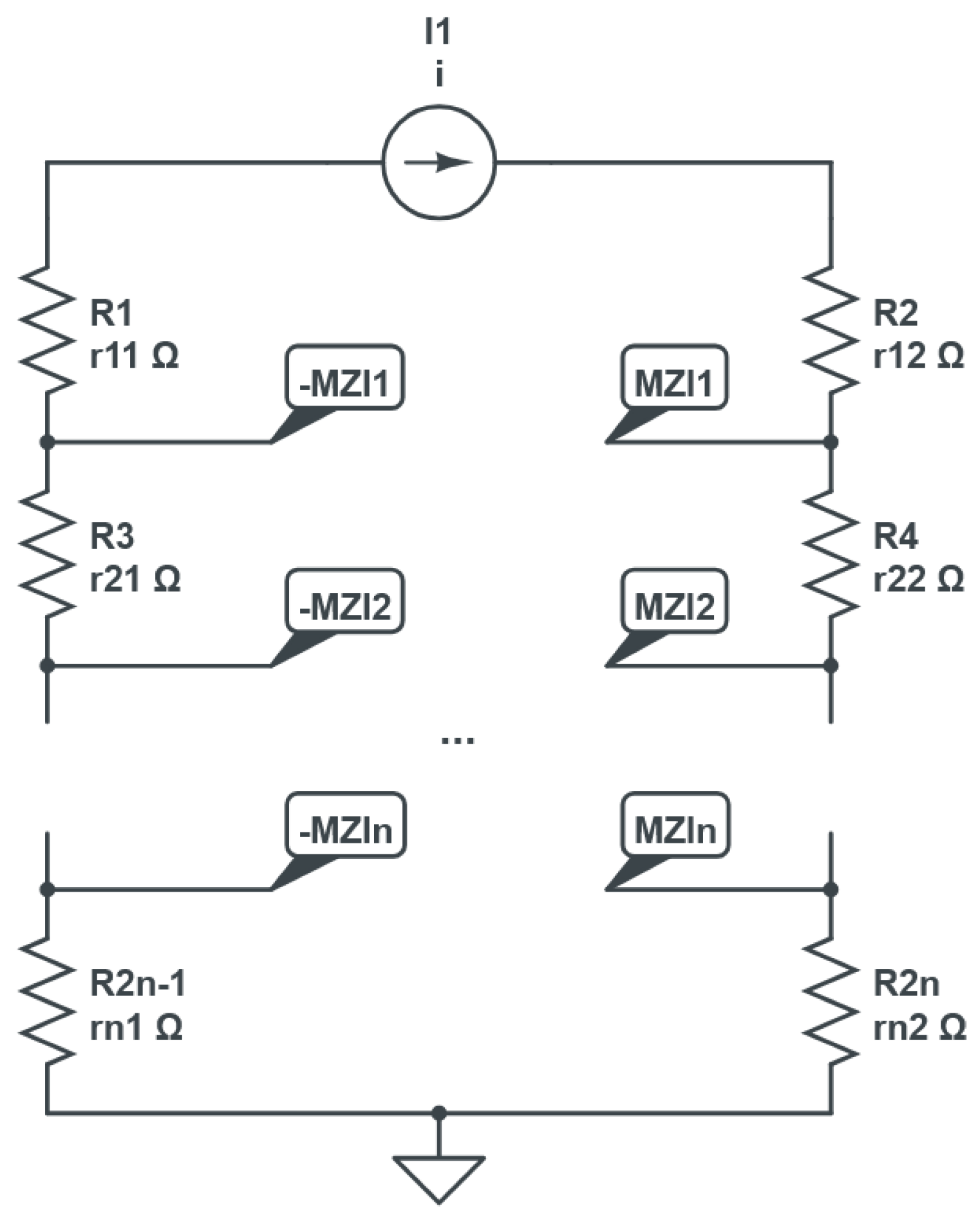 - Series Resistors (): These resistors are connected in series. The voltages across specific segments of the chain will provide the necessary individual voltages for each MZI arm.