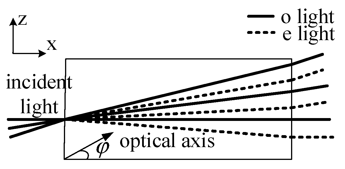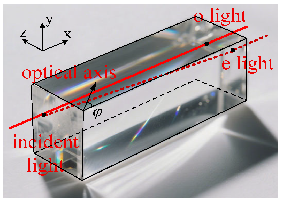 - Ren, H.X.; Liu, L.R.; Song, Z.; Ruan, Z. Continuous birefringence and bireflection in crystals with arbitrary optical axis directions. Acta Opt. Sin. 2004, 33, 1397–1400. [Google Scholar]