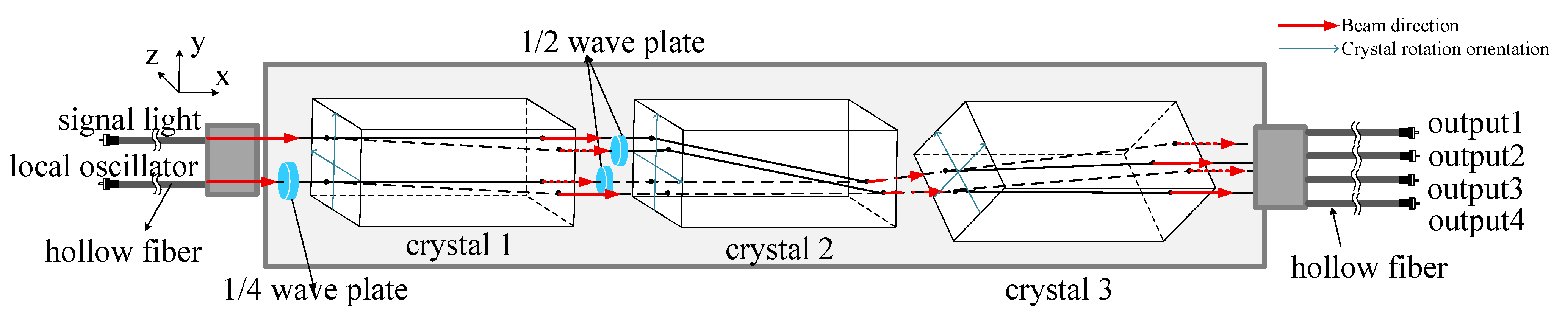 - To obtain the optimal output splitting ratio and mixing efficiency, it is necessary to ensure that the frequency difference between the signal light and local oscillator is small, the topological charges are the same, the polarization states are 45° linear polarization, the accuracy of the optical axis is controlled within 0.5°, and the crystal angle is controlled within 0.3°.
