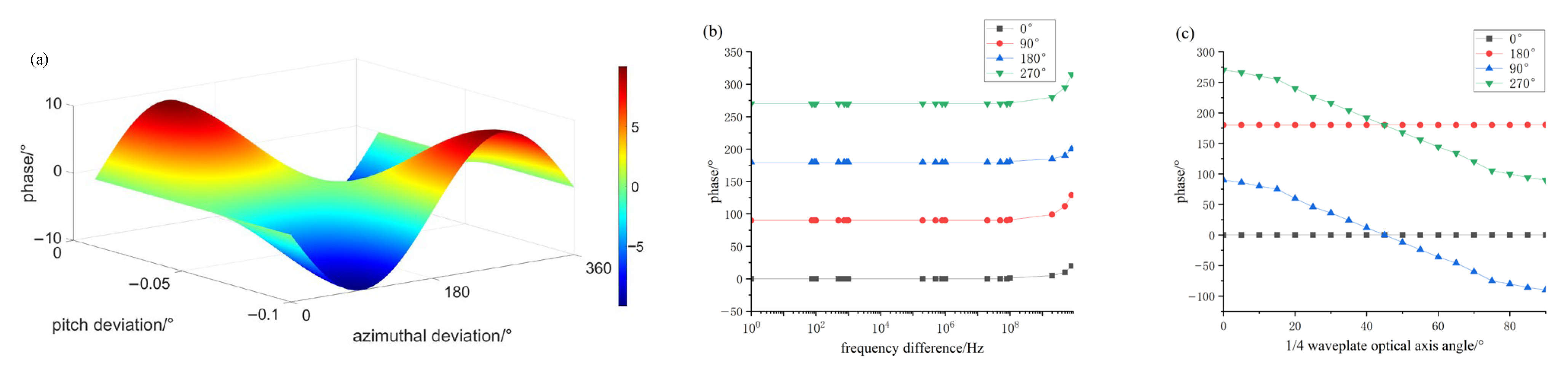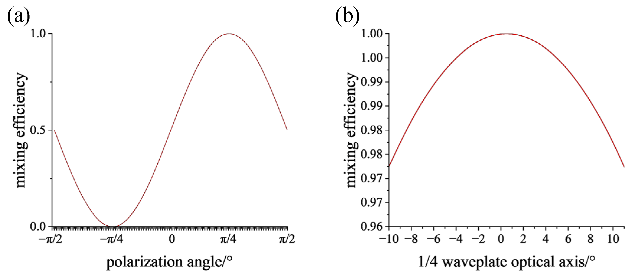 - The insertion loss of the optical mixer is about 1.9 dB, and the whole optical mixer is 36.6%. The phase error of the four output signals is small, and the crystal angle has a larger effect on the output phase, and the 1/2 and 1/4 wave plate angles have a negligible effect, about 0.03°.
