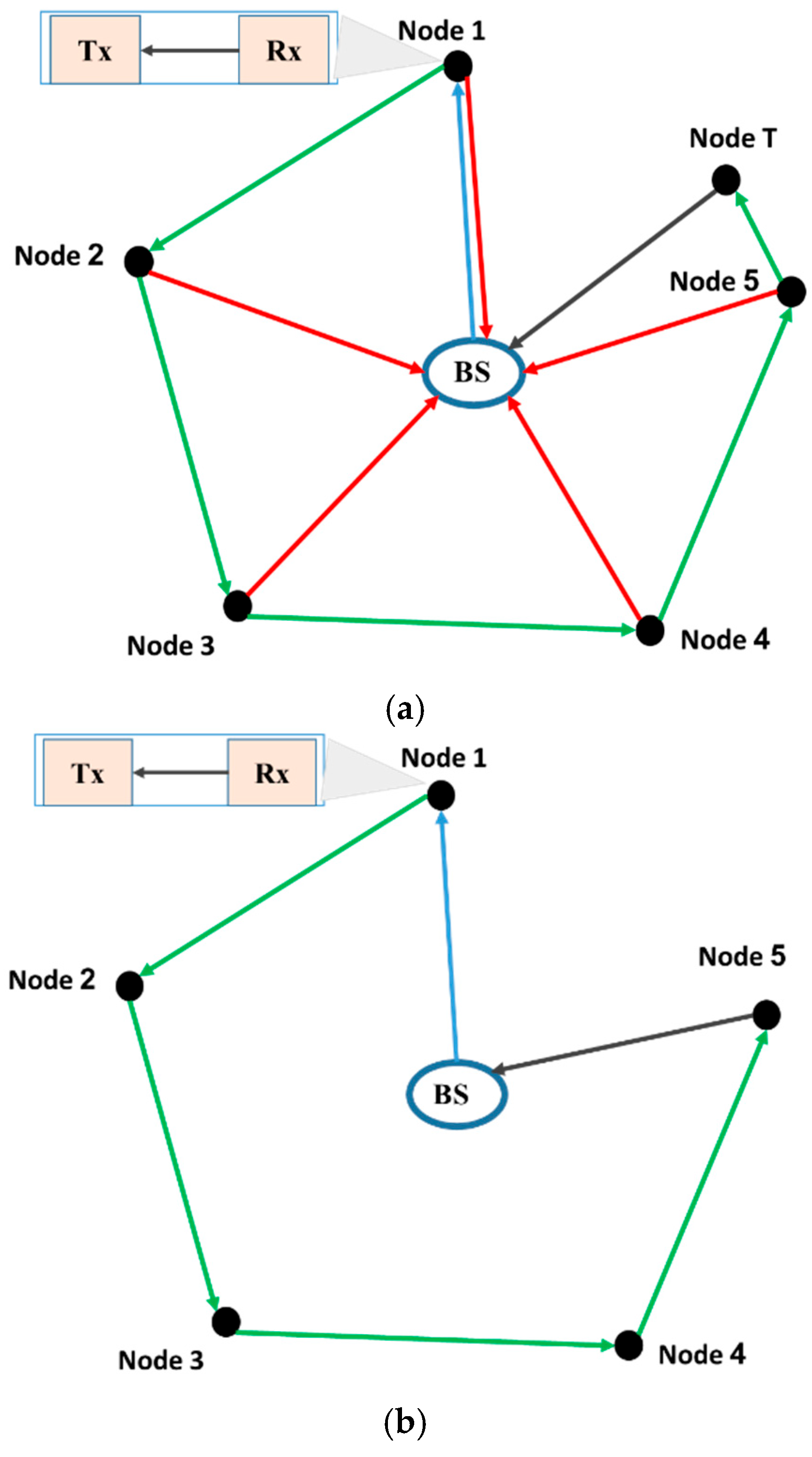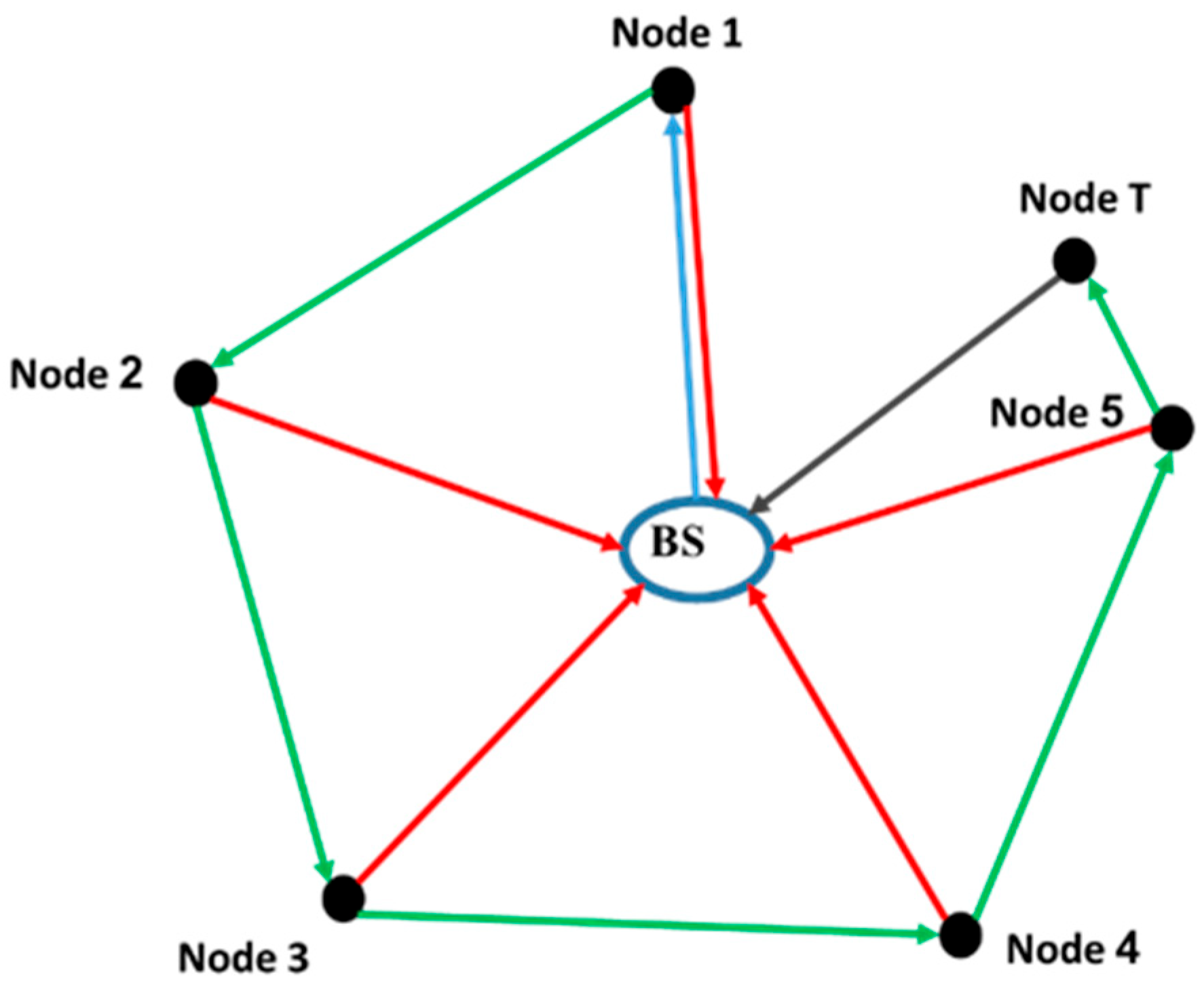 - System (2): A system in which all nodes within the network are inspected, following which the signal is relayed back to the BS by the last node in the network [51]. This system is shown in Figure 9b. The signal needs to pass through all the nodes in succession to reach the last node, which is the only node in the system that can send the signal to the BS.