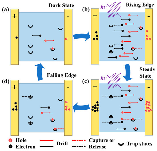 This divergence in response times stems from fundamentally distinct physical mechanisms, as detailed in Figure 5. The operational cycle of the hBN-based MSM photodetector encompasses four key stages of carrier dynamics: (a) Under dark equilibrium, the device exhibits minimal dark current, sustained only by sparse thermally generated carriers, while trap states remain largely unoccupied. (b) Upon illumination onset, a surge of photogenerated electron–hole pairs undergoes rapid field-driven drift. The concurrent trapping of carriers has negligible influence on the photocurrent rise, owing to the predominance of free carriers. (c) In the steady state, trap saturation is achieved, and a dynamic equilibrium is established between carrier generation and collection, yielding a stable photocurrent. (d) During the recovery phase, a biphasic decay emerges: an initial rapid sweep-out of free carriers, followed by a slow tail arising from thermal emission of carriers—especially holes—from deep-level trap states.