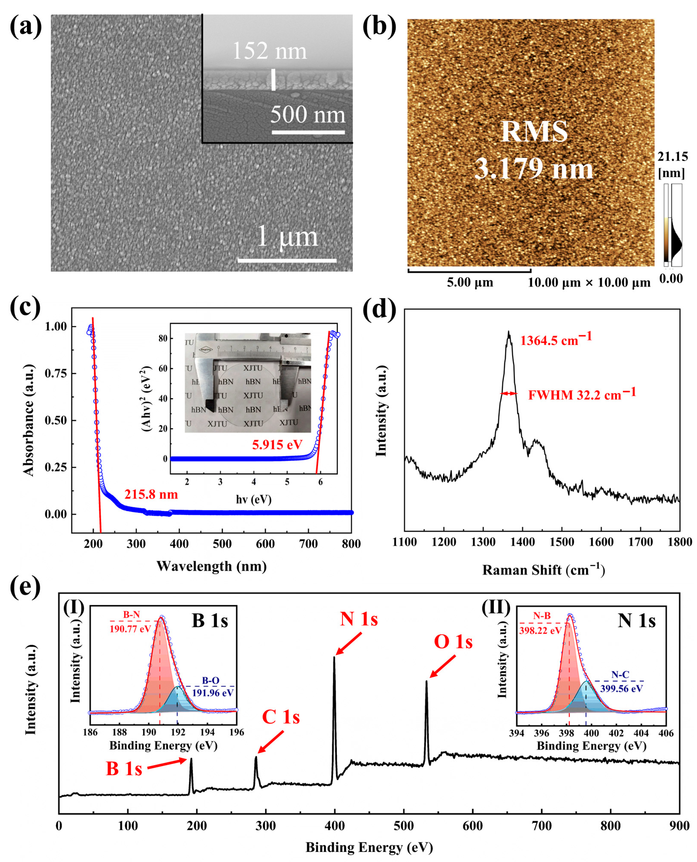 - Chen, R.; Li, Q.; Zhang, Q.; Li, J.; Zhang, Z.; Fang, W.; Wang, L.; Yun, F.; Wang, T.; Hao, Y. High-Crystallinity and High-Temperature Stability of the Hexagonal Boron Nitride Film Grown on Sapphire. Cryst. Growth Des. 2023, 23, 8783–8792. [Google Scholar] [CrossRef]