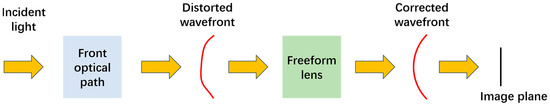 In the following paragraphs, we propose a method for the direct construction of a freeform surface designed to correct wavefront distortion. As illustrated in Figure 1, incident light traverses the front optical path, resulting in a distorted wavefront characterized by asymmetric aberrations. To rectify this distorted wavefront, a freeform lens was integrated into the optical path, facilitating the achievement of an optimal image on the final image plane.