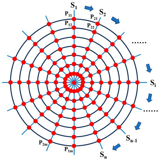 (i) Acquisition of points on the entrance pupil for ray tracing. To obtain data points on the freeform surface, a ray tracing method can be utilized for direct computation. A sufficient number of points were sampled from the entrance pupil, with each point serving as the origin of a tracing ray directed along the central FOV. Sampling was conducted along m concentric rings and n radial arms within the pupil. As illustrated in Figure 2, these rings and arms were evenly distributed both radially and angularly, respectively. The entrance pupil was segmented into n planes Si (i = 1, 2,..., n) in the angular dimension. Consequently, data points on the freeform surface were also organized into n planes corresponding to this angular division.