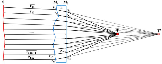 (ii) Establishing the initial configuration of the light path. To elucidate the methodology for constructing a freeform surface, we analyzed the ray tracing model of all rays on the first slice (S1) of the entrance pupil. As illustrated in Figure 3, the left side depicts incident light exhibiting wavefront distortion after passing through the front optical system. The rays denoted as , , …, originate from this front optical system and can be traced from the entrance pupil to the freeform surface. The region between M11 and M12 represents a freeform lens with a refractive index n, where M11 is characterized as a freeform surface and M12 as a planar surface. The intersections of , , …, with M11 yield points P11, P12, …, P1m, respectively. Similarly, for refracted rays intersecting with M12, we obtain intersection points Q11, Q12,…, Q1m. Point T’ is defined as the intersection of extended lines connecting pairs , , …, . This point serves both as a virtual image point following its passage through M1 and a virtual object point prior to reaching surface M2. In an ideal scenario devoid of aberrations, point T’ should ideally coincide at one singular location. Point T represents the final image position derived from T’ after being imaged by surface M2.