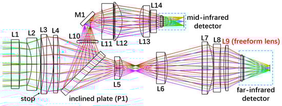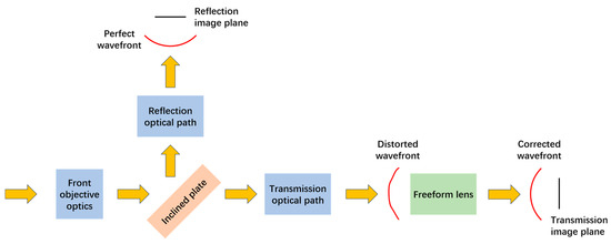 In order to verify the effectiveness of utilizing freeform lenses for correcting asymmetric aberrations, an infrared dual-band composite detection system has been designed, as schematically illustrated in Figure 5. The incident light first passes through the front objective lens and reaches the inclined plate for splitting. The mid-infrared band is reflected and directed into the reflection optical path, resulting in a perfect wavefront that exhibits no asymmetric distortion; this wavefront is ultimately focused onto the corresponding image plane. Meanwhile, the far-infrared band traverses through the inclined plate into the transmission optical path. The resulting distorted wavefront is subsequently corrected using a freeform lens before being focused onto its respective image plane.