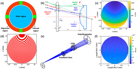 To ensure the machining accuracy of freeform lenses, a computer-generated hologram (CGH)-based interferometric null test method is commonly employed for high-precision metrology of freeform surfaces [25]. The CGH generates a complex wavefront through diffraction to compensate for the wavefront introduced by a freeform mirror. As illustrated in Figure 8a, the CGH consists of three regions: the main region, the alignment region, and the fiducial region. The metrological principle underlying the CGH is depicted in Figure 8b, where alignment is achieved using an autocollimation method. A 632.8 nm laser interferometer is commonly utilized for testing optical paths. The spherical wavefront produced by the interferometer is retroreflected by the alignment CGH. Subsequently, this retroreflected wavefront interferes with the reference wavefront generated by the interferometer. By analyzing the resulting interferogram, we can determine whether there are any issues such as tilt, defocus, or decentering. If the CGH is positioned correctly within its nominal parameters, a null fringe will be observed, indicating that proper alignment has been achieved between the CGH and the interferometer. The fiducial CGH serves to project specific spots onto predetermined locations on the freeform surface to facilitate adjustments in its position. The methodology employed for calculating the phase of the CGH through ray tracing is illustrated in Figure 8b. Based on the direction of light rays, phase distributions across these three regions can be determined using ray tracing techniques [26]. The phase distribution corresponding to the main CGH is illustrated in Figure 8c as an integer multiple of 2π. Figure 8d depicts the binary fringe pattern for an amplitude CGH element, with one line representing 30 fringes in reality. The minimum linewidth of these fringes measures 5.7 µm and can be fabricated utilizing a direct-laser-writing machine. Figure 8e presents the optical path for testing with CGH within ZEMAX software, emphasizing the relative positional relationships among the interferometer, CGH, and freeform lens. Furthermore, as demonstrated in Figure 8f, the residual wave aberration measured by this CGH for freeform lens L9 does not exceed PV ~1/204 λ, where λ denotes a wavelength of 632.8 nm. This suggests that when the processing of the CGH and the alignment of the testing optical path achieve an optimal state, the wavefront error solely resulting from the CGH design will not exceed this value. Nevertheless, in actuality, errors (e.g., CGH substrate’s profile, thickness, and refractive index; stripe shape and distortion) are inevitable during the manufacturing process of the CGH, and there are also errors in the relative positions of the components in the testing optical path. Consequently, in practice, this scheme can typically achieve a detection accuracy of PV ~1/12λ value for the freeform surface shape.