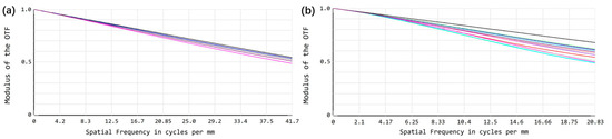 MTF plots at various FOVs for (a) the mid-infrared band and (b) the far-infrared band.
