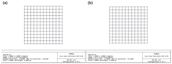 The modulation transfer function (MTF) plots for the final infrared dual-band composite detection system at various FOVs are presented in Figure 9. The MTF for the mid-infrared band exceeds 0.48 at a spatial frequency of 41.67 lp/mm, which corresponds to its Nyquist frequency. In contrast, the MTF for the far-infrared band surpasses 0.48 at a spatial frequency of 20.83 lp/mm, also aligning with its Nyquist frequency. It is evident that the performance of the mid-infrared band approaches the diffraction limit, while that of the far-infrared band remains sufficiently robust. As illustrated in Figure 10, the maximum root mean square (RMS) radius for all spot diagrams across different FOVs is measured at 2.952 μm for the mid-infrared band and 10.381 μm for the far-infrared band; neither value exceeds their corresponding Airy radii of 10.62 μm and 14.78 μm, respectively. Furthermore, distortion grids are provided in Figure 11, where it can be observed that the maximum relative distortions for both mid-infrared and far-infrared bands do not exceed −0.4% and −0.1%, respectively. These results demonstrate that freeform lenses can effectively correct asymmetric aberrations in optical systems.