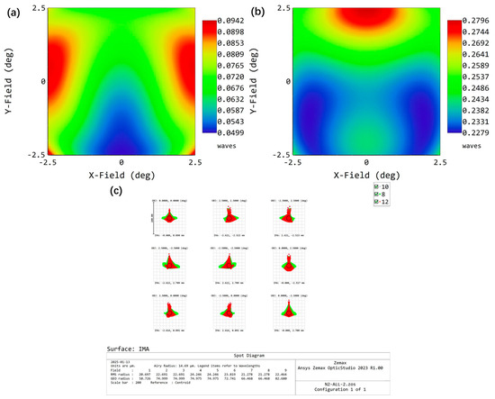 Consequently, following the wavefront compensation achieved through a freeform lens, the far-infrared band has demonstrated commendable imaging quality, effectively meeting general detection criteria (with spot sizes on the image plane not exceeding 2 × 2 pixels). In order to facilitate an intuitive comparison of the contribution made by the freeform lens, we extracted it from the optical path and re-optimized the far-infrared band while keeping the size of the optical path basically unchanged. The wavefront distributions for the full FOVs, both with and without the freeform lens, are presented in Figure 12a,b, respectively. It is evident that the introduction of the freeform corrector significantly reduced the wavefront error of the far-infrared band, both in terms of the central FOV and the edge FOV. Furthermore, the spot diagram at various FOVs for the optical path without the freeform lens is illustrated in Figure 12c. By comparing with Figure 10b, it can be observed that the spot diagram of the optical system lacking freeform surface correction exhibits pronounced astigmatism characteristics. In contrast, the astigmatism features present in the spot diagram of the corrected optical system are significantly diminished. As a result, the implementation of freeform lens effectively mitigates wavefront distortions induced by inclined beam splitters in common aperture optical systems. This advancement facilitates the achievement of superior detection and imaging performance. In addition to common aperture optical systems, the incorporation of freeform elements—such as lenses or mirrors—for the correction of wavefront distortion is also applicable to a wider range of fields, especially asymmetric aberrations arising from an extensive FOV. However, the addition of freeform lens will also cause some adverse effects on the entire common aperture optical system, mainly a reduction in the far-infrared band’s transmittance. Hence, it is crucial for the freeform lens to be coated with an anti-reflection film designed for wavelengths ranging from 8 μm to 12 μm, akin to that of other lenses (L5~L8) in the far-infrared band. Typically, such an anti-reflection coating can ensure an average transmittance of approximately 98% for a single surface of a lens. When incorporating the freeform corrector, however, there is a reduction in transmittance for the far-infrared band by a factor of (98%)2 ≈ 0.96. This decrease has minimal impact on overall performance.