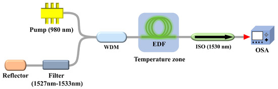The optical path of the ASE source is shown in Figure 1. The 980 nm pump light emitted by the pump laser was launched into the EDF under test via one arm of the wavelength division multiplexer (WDM). An optical fiber isolator (ISO) was connected at the end of the EDF to prevent the reverse-transmitted light at the back-end optical path from being reflected back into the EDF to form lasing. The functions of the filter and reflector in the other arm of the WDM are respectively to obtain a symmetrical Gaussian spectral shape of the ASE source around 1530 nm and to reflect the signal light back to the EDF for re-amplification.