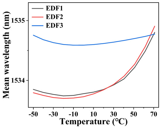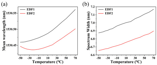 The 2.13 m EDF1 and 2.5 m EDF2 were integrated into the optical path shown in Figure 1 for performance evaluation. As shown in Figure 4, the spectral characteristics of ASE sources utilizing EDF1 and EDF2 were obtained by sequentially splicing them into the optical path, with a pump power of 32 mW and within a temperature range of −50 to 70 °C. Figure 4a depicts the mean wavelength versus temperature across the entire temperature range. Notably, the mean wavelength of the ASE source utilizing EDF1 exhibits a continuous increment with rising temperature throughout the entire temperature span. However, for EDF2, the mean wavelength first decreases with temperature from −50 to −20 °C, and then increases with temperature from −20 to 70 °C. This phenomenon aligns with our prior derivations and simulation results.