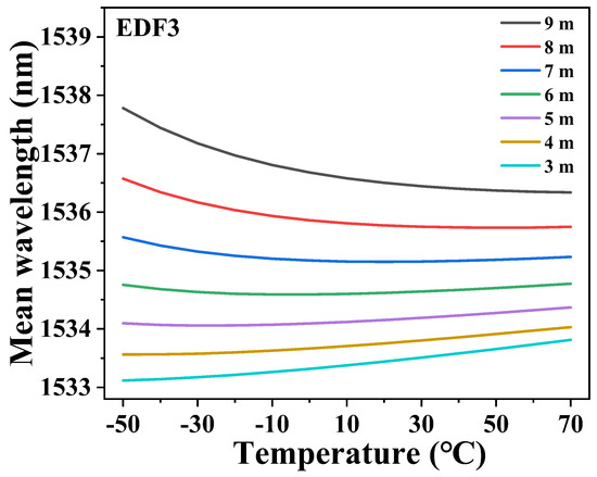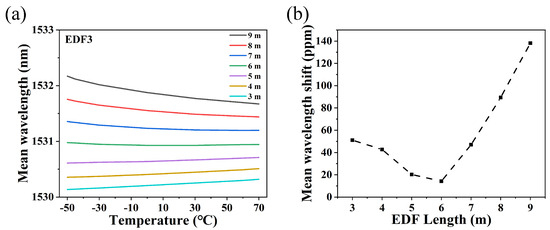 To validate the simulation results shown in Figure 3, the VPD method combined with the MCVD process was employed to fabricate EDF3. The mean wavelength variation of the ASE source utilizing EDF3 with lengths from 3 to 9 m was measured across the temperature range of −50 to 70 °C at a pump power of 32 mW, as illustrated in Figure 6a. It becomes apparent that the experimental results closely resemble the simulated results, suggesting that the mean wavelength of the ASE source decreases as the length of EDF3 decreases. This occurs because shorter EDFs possess higher initial gains at shorter wavelengths, which quickly reach saturation, limiting the effective amplification of longer wavelengths [6,32]. Moreover, as temperature rises, ASE sources utilizing 3–5 m EDF3s typically exhibit an increase in mean wavelength, whereas those employing 7–9 m EDF3s tend to experience a decrease. Only ASE sources utilizing 6 m EDF3 demonstrate relative stability in mean wavelength, consistent with the previous simulation outcomes. Figure 6b depicts the correlation between the mean wavelength shift and EDF3 length, derived from Figure 6a data, providing additional confirmation for the simulations. Specifically, the ASE source employing 6 m EDF3 exhibits the lowest mean wavelength shift, approximately 14.2 ppm, as shown in Table 3. Consequently, the mean wavelength shift is notably reduced compared to ASE sources utilizing EDF1 and EDF2. This phenomenon is attributed to the disturbance caused by higher levels of doped ions within EDF1 and EDF2, leading to greater intrinsic instability, thereby complicating temperature control precision [12].
