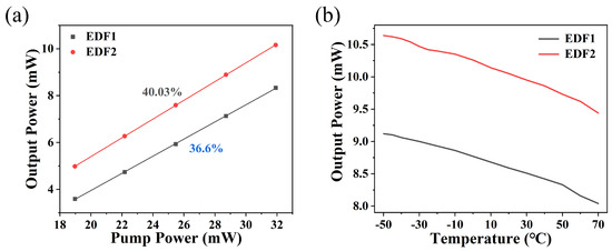 Comparison of output power between ASE sources utilizing EDF1 and EDF2. (a) Output power as a function of pump power; (b) Output power as a function of temperature.