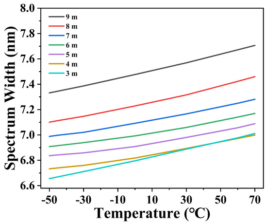 Figure 7 illustrates the variation of spectral width with temperature for ASE sources using different lengths of EDF3. While the spectral width of ASE sources utilizing all lengths of EDF3 increases with temperature, the specific trends vary. Calculations reveal the spectral width change rates of ASE sources for all lengths of EDF3, summarized in Table 3, with the lowest rate found for 6 m length of EDF3, approximately 1.3%.