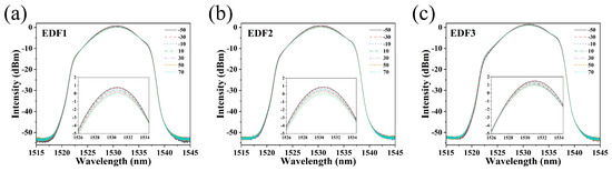 Notably, the spectral profiles of ASE sources utilizing 2.13 m EDF1, 2.5 m EDF2, and 6 m EDF3 with respect to temperature are also recorded, as shown in Figure 8. The figure shows that the output spectra of the ASE source utilizing 6 m EDF3 varies minimally from −50 to 70 °C, further demonstrating that the temperature stability of the ASE source has been effectively improved.