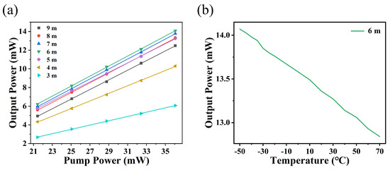 In addition to temperature stability, the power conversion efficiency of ASE sources is another crucial factor in assessing their suitability for high-precision FOGs. To further investigate the power conversion efficiency of ASE sources utilizing EDF3, the output power of ASE sources utilizing EDF3 with varying lengths was measured and recorded in Figure 9a. ASE sources using 6 m EDF3 were found to have a maximum output power of approximately 14.07 mW at a pump power of 32 mW. By performing linear fitting, the operational efficiency of ASE sources for various lengths of EDF3 was determined (Table 3), indicating that the 6 m EDF3 can achieve the highest efficiency of 53.6% for ASE sources. Finally, the impact of temperature variation on the output power of ASE sources was investigated at a pump power of 32 mW, with particular emphasis on EDF3 with a length of 6 m, as shown in Figure 9b. Similar to ASE sources utilizing EDF1 and EDF2, the output power decreases with rising temperature. However, ASE sources utilizing EDF3 exhibit the lowest output power change rate, at approximately 4.5%. These results suggest that selecting the appropriate length of the VPD fabricated EDF3 can significantly improve the maximum output power, operational efficiency, and power stability of ASE sources.