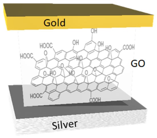GO films (8 nm) were deposited on the silver thin films using a dip-coating process at 0.33 mm/s. A 2 g/L GO dispersion in water, sourced from “Punto Quantico”, was used. Gold thin films (15 nm) were then deposited onto the GO/Ag/glass substrates using the same sputtering system at 4.2 × 10−2 mbar, with a base vacuum of 10−5 mbar and a cathode power of 30 W for 55 s. A schematic of the Ag/GO/Au structure is shown in Figure 1.